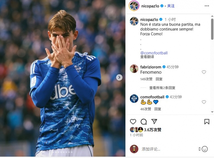 Tiền vệ COMO Nico PA được đăng trên phương tiện truyền thông xã hội để khuyến khích nhóm.