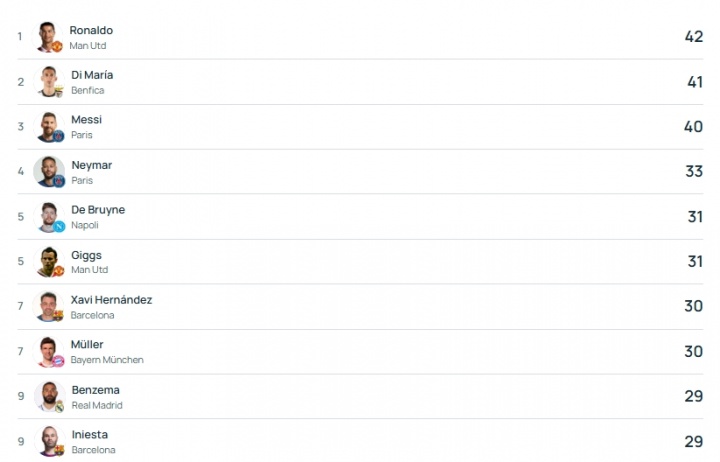 Champions League Hỗ trợ lịch sử: Ronaldo xếp hạng đầu tiên, De Bruyne đã tăng lên thứ năm và là người duy nhất trong năm giải đấu hoạt động