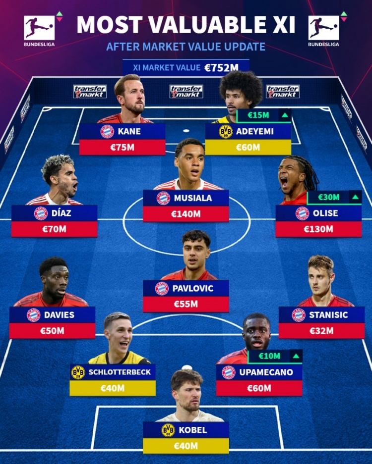 Đội hình đắt giá nhất Bundesliga: Bayern 8 cầu thủ + Dortmund 3 cầu thủ, Musiala 140 triệu euro, Olise 130 triệu euro
