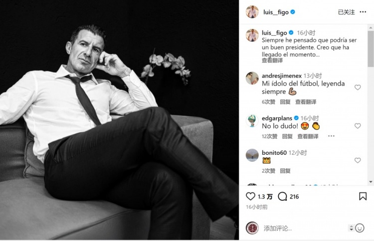 Mạng xã hội của Figo đăng một bức ảnh anh mặc vest trang trọng với dòng chữ: "Tôi luôn nghĩ rằng mình có thể trở thành một chủ tịch giỏi và tôi nghĩ thời điểm đã đến."