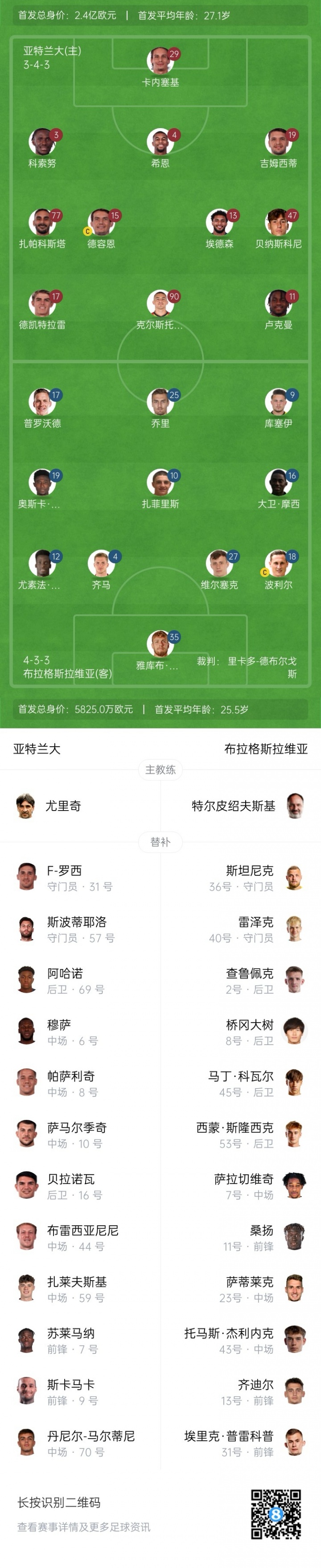 Những cầu thủ dự bị của Atlanta: 31-Ronald West, 57-Sportiello, 69-Ajano, 16-Bellanova, 6-Musa, 8-Pasalic, 10-Samardzic, 44-Bresciannini, 59-Zalewski, 7-Suleimana, 70-Daniel Maldini, 9-Scamaka