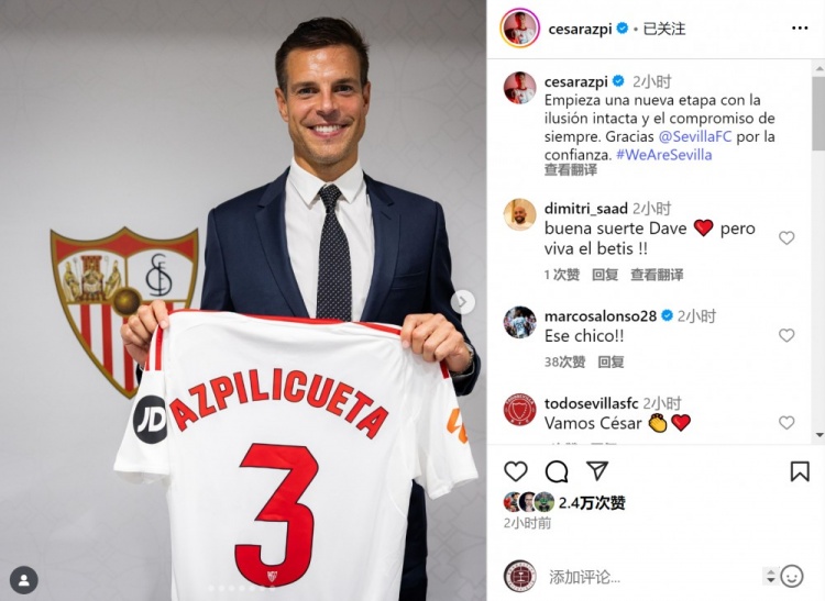 Aspilicueta đã tham gia Sevilla một cách tự do. Anh ấy đã đăng những bức ảnh về chiếc áo của mình hiển thị trên phương tiện truyền thông xã hội và viết: "Với sự nhiệt tình và cam kết không thay đổi như mọi khi, chúng tôi bắt đầu một hành trình mới. Cảm ơn Sevilla vì sự tin tưởng của anh ấy."