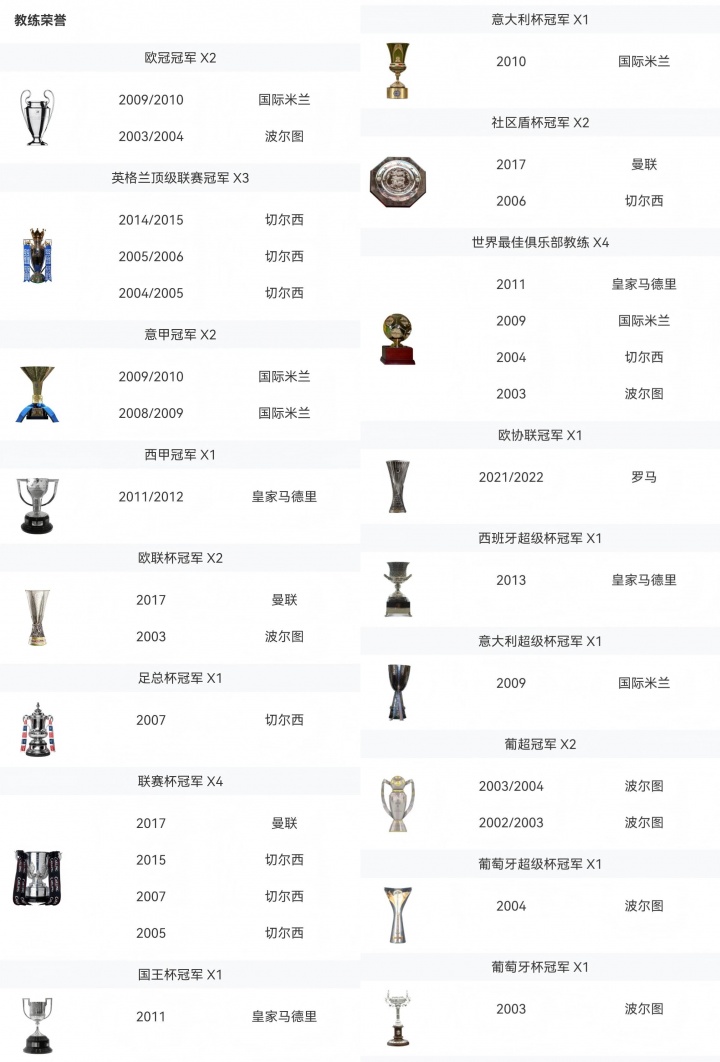 Mourinho đã được huấn luyện trong 25 năm và đã giành được tổng cộng 26 chức vô địch. Trong số tất cả các đội huấn luyện cả mùa giải, chỉ có Tottenham và Fenerbahce không giành được chức vô địch.
